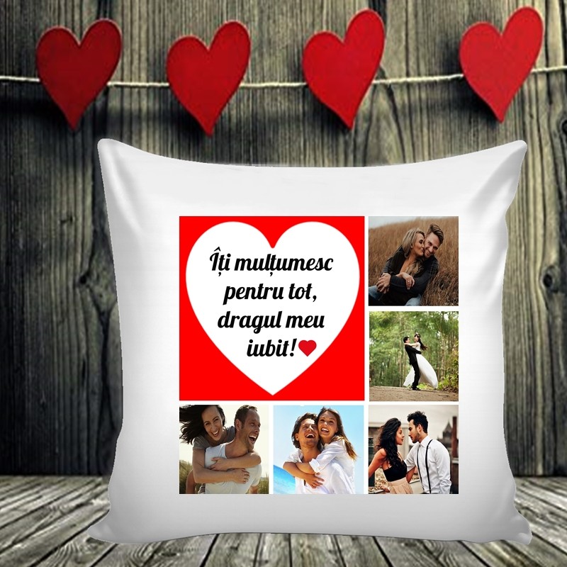 Pernă personalizată cu 5 poze și mesaj în inimioară, un cadou perfect pentru cupluri, îndrăgostiți și nu numai, o pernă personalizată o poți face cadou oricărei persoane dragi din viața ta, este acel cadou cu care vei merge la sigur, iar acea persoană se va bucura enorm de mult, este un cadou personalizat care dăruieste emoție, bucurie și iubire.