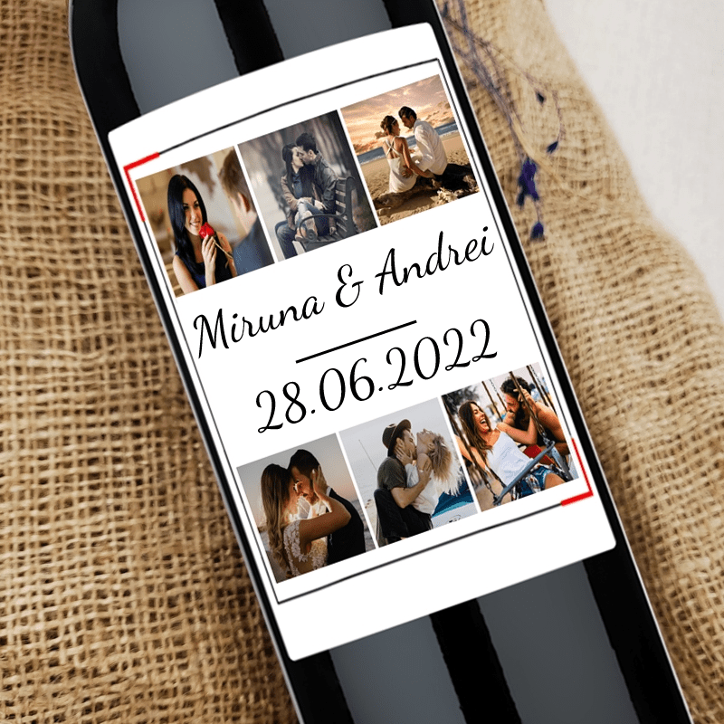 Sticlă de vin personalizată cu pozele tale, un colaj de până la 6 poze și un mesaj, totul printat la calitate foto premium. Oferă-i cadou persoanei dragi din viața ta o sticlă de vin de care se va bucura enorm, un cadou personalizat cu care vei merge la sigur și vei impresiona 100% indiferent de ocazie. Descoperă toate modelele din categoria sticle de vin personalizate.